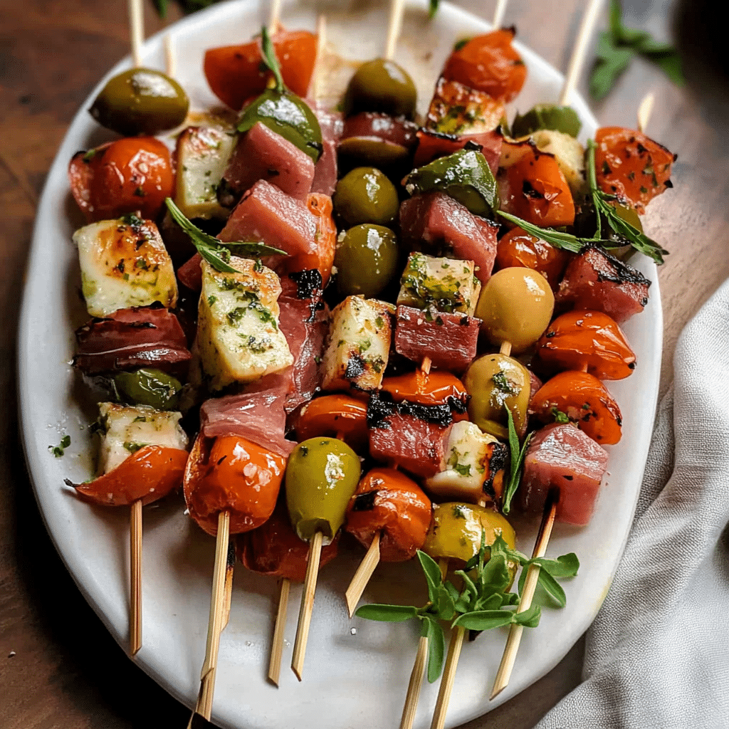 - Marinated Vegetables: The marinated artichokes and roasted red peppers bring extra flavor and color to the skewers.