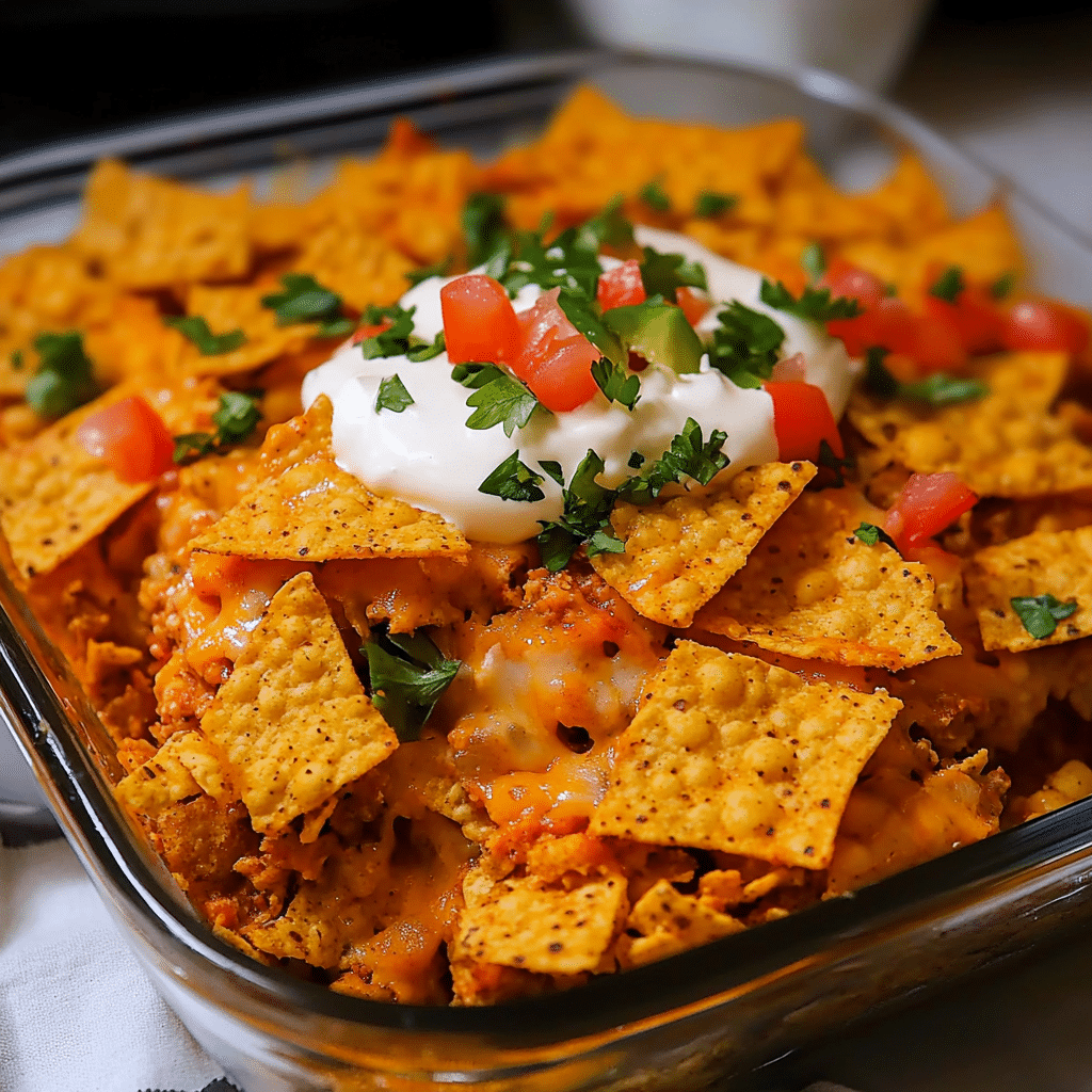 Dorito Casserole is a comforting and flavorful dish that combines layers of seasoned ground beef, creamy cheese, and crunchy Doritos. The base typically includes ground beef cooked with taco seasoning, then mixed with a creamy sauce, such as sour cream or cream of mushroom soup. The casserole is then topped with a generous layer of crushed Doritos, which bake up to create a crunchy, cheesy topping. It’s often finished with melted cheese for extra gooeyness and served with optional toppings like lettuce, tomatoes, or sour cream. This dish is perfect for a hearty, crowd-pleasing meal with a fun twist on traditional taco flavors.