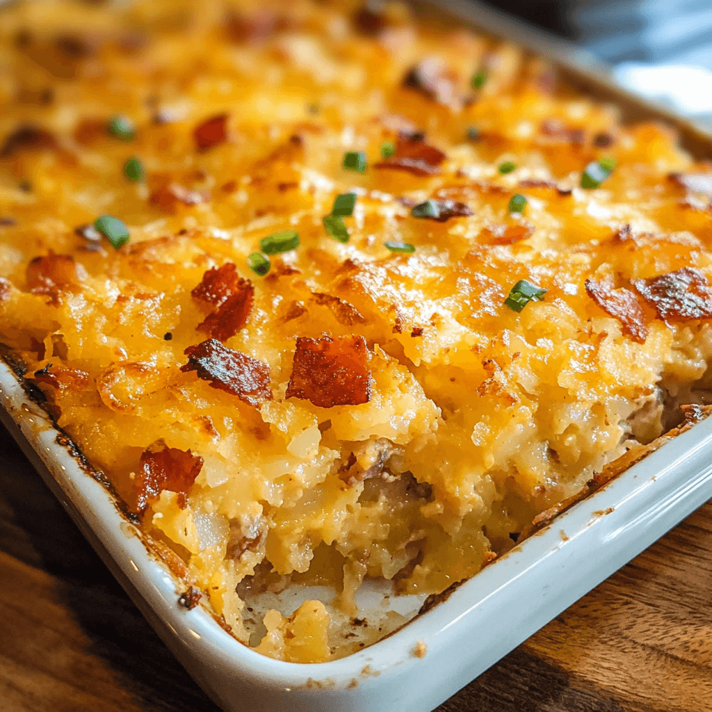 Hashbrown Breakfast Casserole is a hearty and satisfying dish perfect for starting the day. It features crispy golden hashbrowns as the base, layered with savory ingredients like eggs, cheese, sausage or bacon, and a mix of vegetables such as onions and bell peppers. Baked until golden and bubbly, the casserole combines rich flavors and a comforting texture, with the crispy hashbrowns providing the perfect balance to the creamy eggs and melted cheese. It’s a delicious, all-in-one breakfast that’s perfect for feeding a crowd or meal prepping for the week ahead.