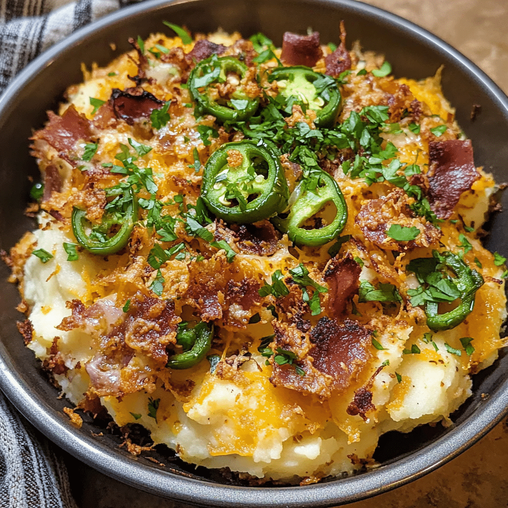 Jalapeno Popper Smashed Potatoes are a bold and flavorful twist on classic mashed potatoes. These creamy, buttery potatoes are smashed to perfection and loaded with all the irresistible ingredients of a jalapeño popper. The potatoes are mixed with spicy, diced jalapeños, crispy bacon bits, sharp cream cheese, and a sprinkle of cheddar cheese, creating a creamy, spicy, and smoky side dish. Topped with extra melted cheese and a few more crispy bacon bits, these potatoes offer the perfect balance of heat and indulgence. Ideal for anyone who loves a little spice, Jalapeno Popper Smashed Potatoes are a crowd-pleasing dish that brings comfort and excitement to your meal.