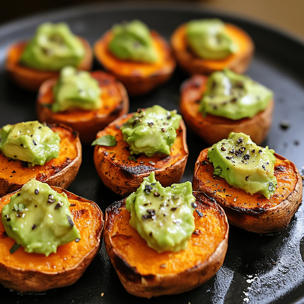 - Top the Sweet Potatoes: Once the sweet potatoes are roasted and cooled slightly, place each piece on a serving platter. Spoon a generous dollop of the mashed avocado mixture onto each sweet potato bite.
