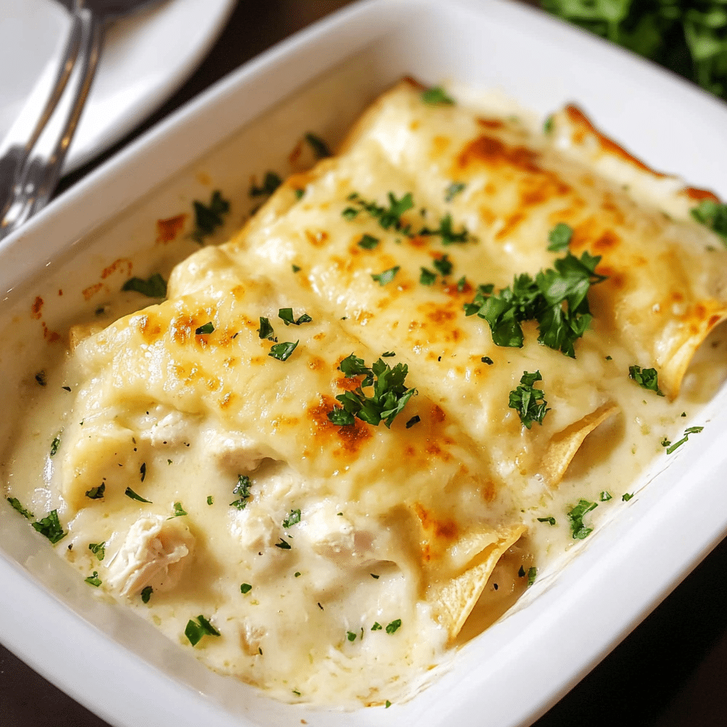 White Chicken Enchiladas are a creamy and flavorful twist on traditional enchiladas. Tender, seasoned chicken is rolled in soft tortillas and smothered in a rich, velvety white sauce made from sour cream, cream cheese, green chilies, and a blend of spices. The dish is then baked until bubbly and golden, with melted cheese on top. Each bite offers a perfect balance of savory chicken, smooth, tangy sauce, and a slight kick from the chilies. Topped with fresh cilantro and a squeeze of lime, these enchiladas are a comforting and satisfying meal that combines creamy indulgence with a touch of zesty flavor.